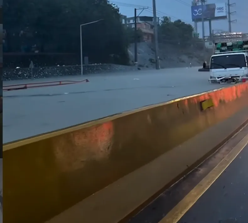 Las lluvias han generado acumulaciones de agua en importantes vías. Imágenes difundidas muestran tramos de la autopista Duarte, específicamente en el elevado de Tricón hacia Los Alcarrizos, con el tránsito interrumpido.