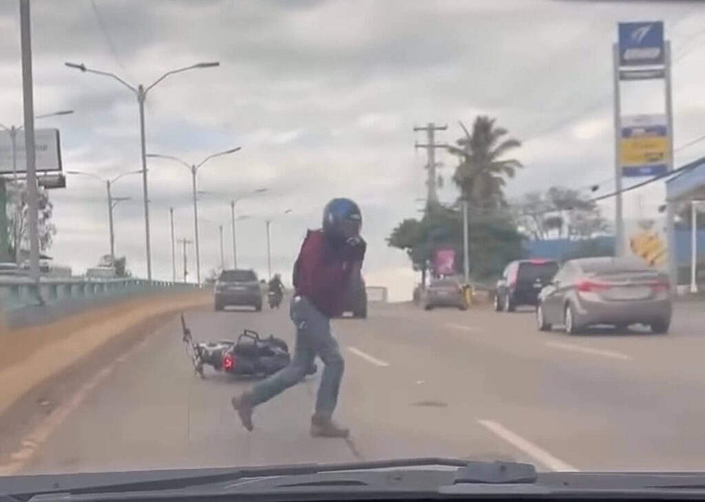 Las imágenes, compartidas ampliamente en plataformas digitales, muestran al conductor de la motocicleta circulando próximo al automóvil cuando, en medio de una aparente discusión, realiza la acción contra el vehículo. Instantes más tarde pierde el equilibrio y cae sobre la carretera ante la sorpresa de otros conductores que transitaban por la zona.